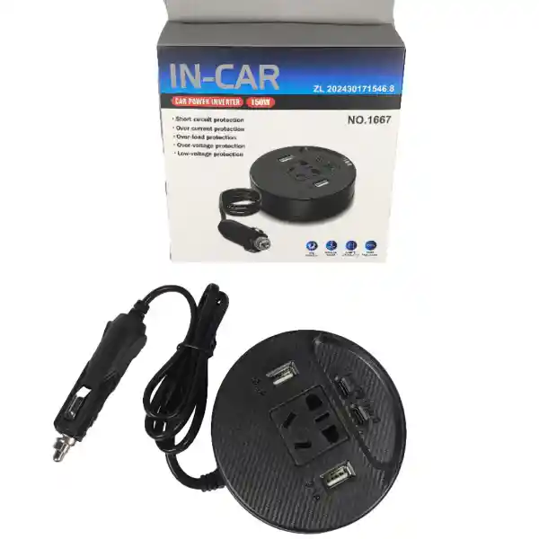 Inversor para Carro 150W – Corriente 110V Conecta y carga tus dispositivos en el carro Ideal para viajes, trabajo y emergencias Enchufe 110V + puertos USB y tipo C para carga rápida