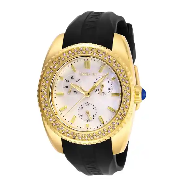 Dama Material: Silicona Modelo: 28489 Color Pulso: Negro Material P: Silicona Colección: Angel Tono Caja: Oro Material Caja: Acero Inoxidable Tablero: Blanco Cristal: Flame Fusion Ancho Banda: 20 Largo: 190 Resistecia al Agua: 100 Size Caja: 38 Tipo de Reloj: Cuarzo
