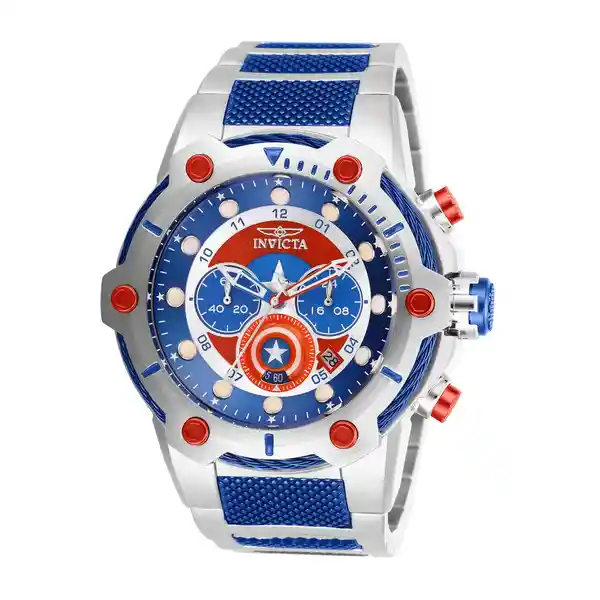Hombre Material: Acero Inoxidable Modelo: 27965 Color Pulso: Azul Acero Material P: Acero Inoxidable Colección: Marvel Tono Caja: Acero Material Caja: Acero Inoxidable Tablero: Azul. Plata. Rojo Cristal: Flame Fusion Ancho Banda: 30 Largo: 197.5 Resistecia al Agua: 100 Size Caja: 51.5 Tipo de Reloj: Quartz