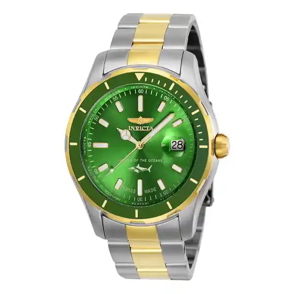 Hombre Material: Acero Inoxidable Modelo: 25816 Color Pulso: Acero Dorado Material P: Acero Inoxidable Colección: Pro Diver Tono Caja: Acero Inoxidable. Oro Material Caja: Acero Inoxidable Tablero: Verde Cristal: Flame Fusion Ancho Banda: 22 Largo: 215 Resistecia al Agua: 100 Size Caja: 44 Tipo de Reloj: Cuarzo