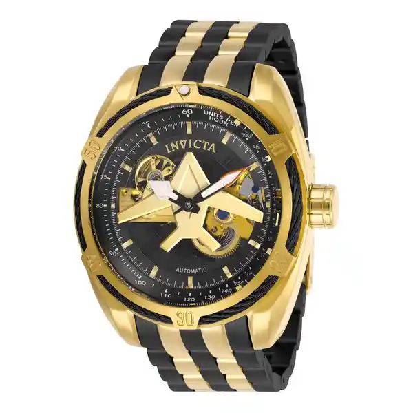 Hombre Material: Acero Inoxidable Modelo: 28217 Color Pulso: Dorado Negro Material P: Acero Inoxidable Colección: Aviator Tono Caja: Oro Material Caja: Acero Inoxidable Tablero: Oro Negro Cristal: Flame Fusion Ancho Banda: 32 Largo: 182 Resistecia al Agua: 100M Size Caja: 50 Tipo de Reloj: Automatic