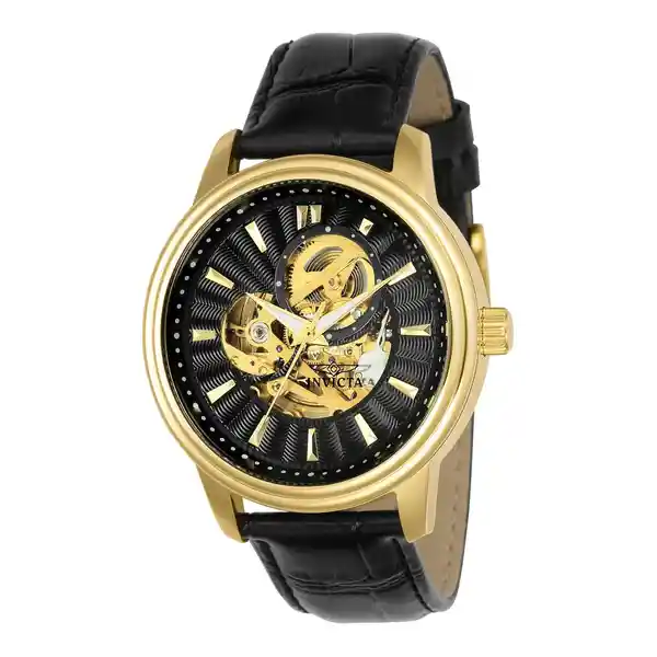 Hombre Material: Cuero Modelo: 22578 Color Pulso: Negro Material P: Cuero Colección: Vintage Tono Caja: Oro Material Caja: Acero Inoxidable Tablero: Negro Cristal: Flame Fusion Ancho Banda: 22 Largo: 190 Resistecia al Agua: 50 M Size Caja: 45 Tipo de Reloj: Automatic