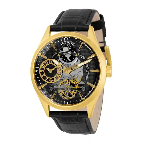 Hombre Material: Cuero Modelo: 30443 Color Pulso: Negro Material P: Cuero Colección: Objet D Art Tono Caja: Oro Material Caja: Acero Inoxidable Tablero: Negro Cristal: Flame Fusion Ancho Banda: 22 Largo: 210 Resistecia al Agua: 50 Size Caja: 43 Tipo de Reloj: Automatic