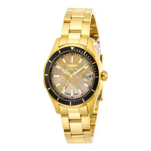 Reloj Invicta 28645 Pro Diver Para Mujer, Tamaño De La Caja 34 Mm De Acero Inoxidable, Tamaño Del Pulso 200 Mm De Acero Inoxidable, Color Dorado, Resistencia Al Agua 100 Metros. Invicta Es Un Estilo De Vida Que Te Proporciona Seguridad Y La Mejor Precision Marcando El Tiempo, Contar Con Una Pieza De Invicta Es Hacer Parte De La Historia Y Continuar Con Un Legado Del Latin Invicta Invencible Fue Fundada El 1837 En La Claux-de-fonds Suiza Por Raphael Picard. Teniendo En Cuenta Los Conceptos Claves De Nuestras Colecciones De Relojes Las Gafas Invicta Implementan Todas Las Notables Cualidades De Elegancia Y Sofisticacion De Las Gafas De Sol Italianas, Diseñadas Y Fabricadas En Italia Con Un Uso Innovador De Materiales Notables Capturan La Esencia Misma De Invicta En Todos Sus Estilos. Transforma Tu Forma De Ver El Dia Con Invicta Eyewear, Cuentan Con Excepcional Diseño Y Construccion Como Otros Muchos Nombres Suizos En Su Tiempo La Idea Desaparecio Durante La Invasion Del Cuarzo En Los Anos 70, En 1991 Descendientes De La Familia Invictare, Establecieron La Firma Cinendose A Los Principios Establecidos Por Raphael Picard.