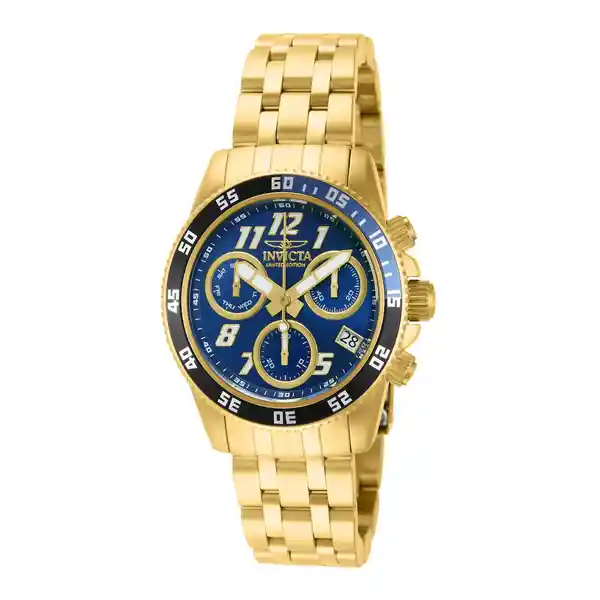 Reloj Invicta 16618_Out Mujer Oro Material Acero Inoxidable Tono de Caja Oro Material de Caja Acero Inoxidable Color Tablero Azúl Metálico Material Cristal Flame Fusión Ancho de Banda 20 Largo de Banda 205 Resistencia al Agua 300 Tamaño de Caja 40 Tipo de Reloj Quartz Calendario Día, Fecha Forma de Reloj Circular Tipo de Movimiento Quartz Tipo de Cierre Seguridad, Foldover