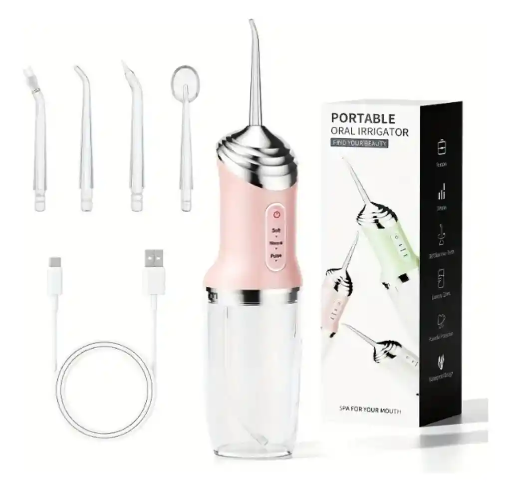 Nuestro irrigador bucal es el compañero ideal para tu cuidado dental diario, diseñado para limpiar y desinfectar hasta los lugares más ocultos de tu boca, donde el cepillado y el hilo dental no alcanzan. Es la solución perfecta para aquellos que usan aparatos ortopédicos, implantes, prótesis y que buscan una higiene dental integral. Características destacadas: Profundidad de limpieza: Alcanza y desinfecta áreas que el cepillado y el hilo dental no pueden, eliminando restos de comida y reduciendo la placa bacteriana. Beneficios para la salud bucal: Ayuda a prevenir las caries y mantener una sonrisa radiante y un aliento fresco. Eficiencia sin dolor: Tres veces más eficaz que el uso del hilo dental, sin causar molestias o dolor. Especificaciones técnicas: Diseño ergonómico para una experiencia de uso cómoda. Limpieza profunda y práctica, con resultados visibles desde la primera sesión. Incluye 4 boquillas diferentes para adaptarte a tus necesidades específicas. Contenido del paquete: 1 Irrigador bucal de última generación. 4 Boquillas de cambio para una limpieza personalizada. 1 Cable USB de carga tipo C