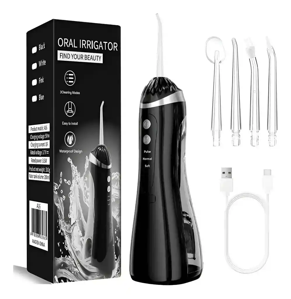 El irrigador dental portátil recargable es un dispositivo de higiene bucal diseñado para limpiar profundamente entre los dientes y las encías mediante un potente chorro de agua a presión que ayuda a eliminar hasta el 99.9 % de la placa y restos de alimentos, mejorando la salud bucal y previniendo problemas como caries, gingivitis y mal aliento. Este modelo cuenta con 3 modos de limpieza (pulso, normal y suave) para adaptarse a diferentes necesidades, desde limpieza profunda hasta cuidado para encías sensibles, además de 4 boquillas intercambiables con rotación de 360° ideales para limpieza diaria, ortodoncia, bolsas periodontales y raspado de lengua. Incorpora batería recargable de 1200 mAh con carga USB tipo C, tanque de agua de 200 ml para mayor autonomía durante el uso y protección impermeable IPX7, lo que permite lavarlo fácilmente e incluso usarlo con seguridad en el baño o la ducha. Gracias a su diseño portátil y ergonómico, es perfecto para usar en casa, viajes o después de las comidas, ofreciendo una limpieza dental profesional de forma práctica y cómoda. Contenido del paquete: 1 Irrigador dental portátil 4 Boquillas intercambiables 1 Cable de carga USB tipo C 1 Manual de usuario Ficha Técnica: Dimensiones aproximadas: 28.5 cm x 7 cm x 8 cm Capacidad del tanque de agua: 200 ml de capacidad para limpieza completa sin recargar frecuentemente. Presión del agua: 30 – 120 PSI de presión ajustable para limpieza profunda. Frecuencia de pulsos: Aproximadamente 1200 – 1700 pulsos por minuto para eliminar placa y restos de comida. Modos de limpieza: Modo Pulso: masaje de encías Modo Normal: limpieza profunda Modo Suave: para encías sensibles Número de boquillas: 4 boquillas intercambiables con rotación de 360° Capacidad de la batería: 1200 mAh batería recargable de larga duración. Tipo de carga: USB Tipo C Voltaje de funcionamiento: 3.7 V batería de litio recargable. Autonomía aproximada: Hasta 2 a 4 semanas de uso dependiendo de la frecuencia. Nivel de protección: IPX7 resistente al agua (apto para usar en el baño o ducha). Material: Plástico ABS de alta resistencia y componentes electrónicos sellados Para defectos de fábrica o retractos: Por favor revise el producto apenas lo reciba y antes de usarlo. No aplican ley de retracto o defectos de fábrica luego de usar el producto. Se manejan máximo 5 días para reportar defectos de fábrica (por ejemplo, producto funciona mal, piezas faltantes, rotas, etc). Para hacer efectiva la devolución el producto debe devolverse con el empaque original, el cual debe estar en buen estado, incluir todos los documentos y las partes completas y sin daños.