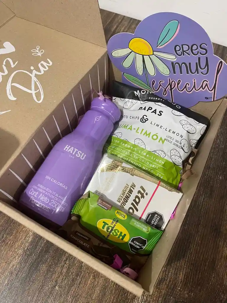Caja Italo Box incluye: Botella deTé Hatsu 250ml(sabor a disponibilidad), Italo Almendra Francesa (50g), Snacks Monterojo(26,25 c/u), Paquete Galleta Tosh (24g), Caja, moño y tarjeta (de: para:). La caja se envia en una bolsa sellada con sticker alusivo a la celebración. *Caja y tarjeta disponible: Cumpleaños,Amor, Feliz Dia, Feliz dia Mujer, Feliz dia hombre, Mamá, Papá., san valentin. TU PEDIDO INCLUYE TARJETA !!! INGRESA EL MENSAJE QUE DESEAS ENVIAR EN "COMENTARIO AL SHOPPER"