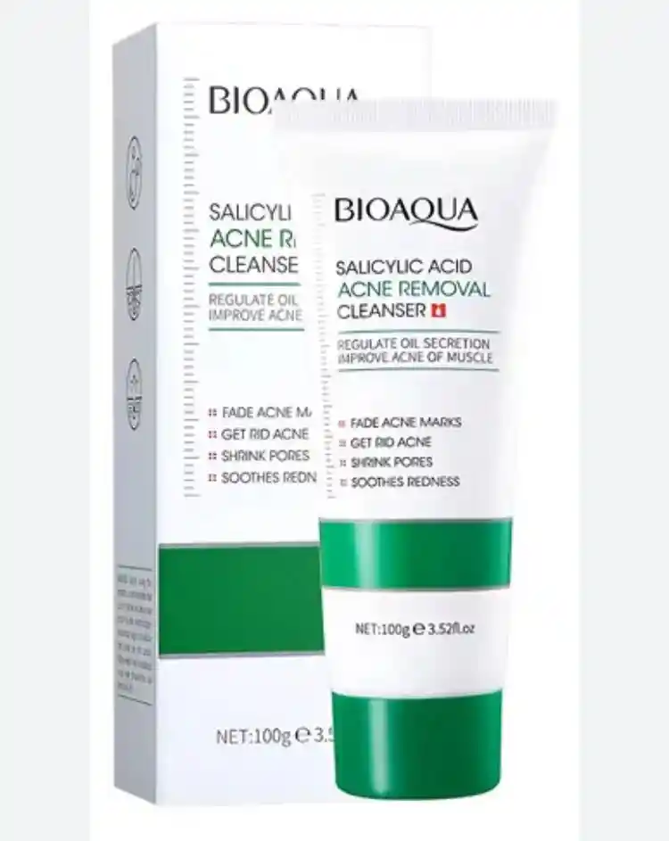 El artículo es un limpiador facial antiacné con ácido salicílico de la marca Bioaqua. Sus características clave incluyen: Contiene ácido salicílico, conocido por sus propiedades para combatir el acné. Ayuda a regular la secreción de grasa. Diseñado para desvanecer las marcas de acné y reducir los poros. Alivia el enrojecimiento y la inflamación de la piel. El contenido neto es de 100g.