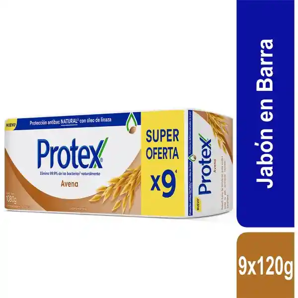 Protex® Avena. Su fórmula con avena ayuda a cuidar tu piel, removiendo impurezas suavemente.Beneficios:- Protección antibac NATURAL² con óleo de linaza- Elimina el 99.9% de las bacterias naturalmente 3- Su fórmula con avena ayuda a cuidar tu piel - Remueve impurezas suavemente- Crea una barrera de protección prolongada que ayuda a prevenir la poliferación de bacterias en su piel'
