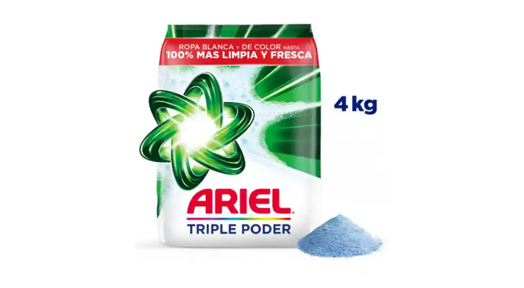 Detergente en Polvo Ariel Triple Poder 4 kg – Limpieza profunda y frescura duradera El detergente en polvo Ariel Triple Poder, en su presentación de 4 kg, está formulado para brindar una limpieza superior desde el primer lavado. Su tecnología penetra profundamente en las fibras de las prendas, eliminando manchas difíciles y dejando un agradable aroma fresco. Características: • Limpieza profunda que elimina manchas difíciles • Aroma fresco y duradero • Fórmula mejorada que se disuelve fácilmente sin dejar residuos • Apto para ropa blanca y de color • Presentación familiar de 4 kg, ideal para varios lavados Una excelente opción para quienes buscan eficiencia, rendimiento y el mejor cuidado para su ropa en cada lavado.
