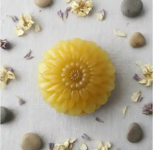 Jabón artesanal de manzanilla con base en glicerina y vitamina E. - Elaborado con glicerina de alta calidad. - Diseños variados, puede llegar en forma de girasol, flor, rosa, - Color amarillo translúcido. USOS Y RECOMENDACIONES para uso en el rostro y cuerpo, ideal para pieles sensibles a normales. Se recomienda mantener en lugar seco y fresco para conservar su forma y aroma. BENEFICIOS Limpieza suave, es calmante y brinda hidratación.