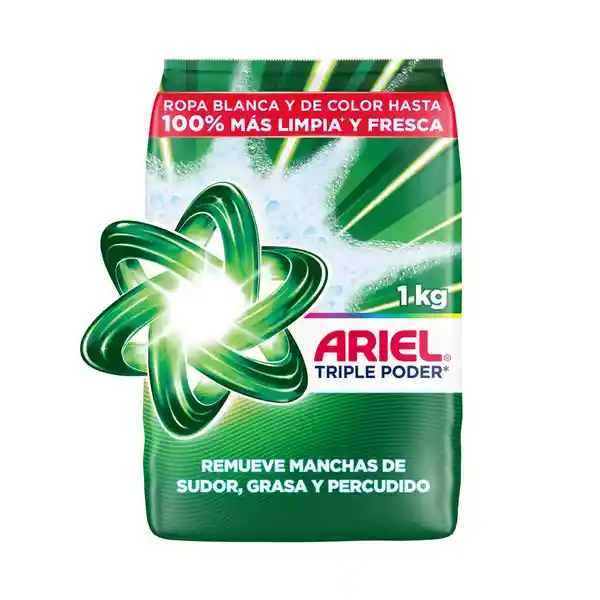 Nuevo Detergente en Polvo Ariel Triple Poder con su fórmula mejorada para una limpieza impecable. A través de su triple poder remueve manchas difíciles y de sudor dejando la ropa super limpia y con un aroma que perdura. ¿Cómo usar Ariel Triple Poder? - Carga regular / sucio ligero: 1 taza y media.- Carga pesada / muy sucia: 2 tazas.*Surfactante, enzima y tecnología contra el mal olor.