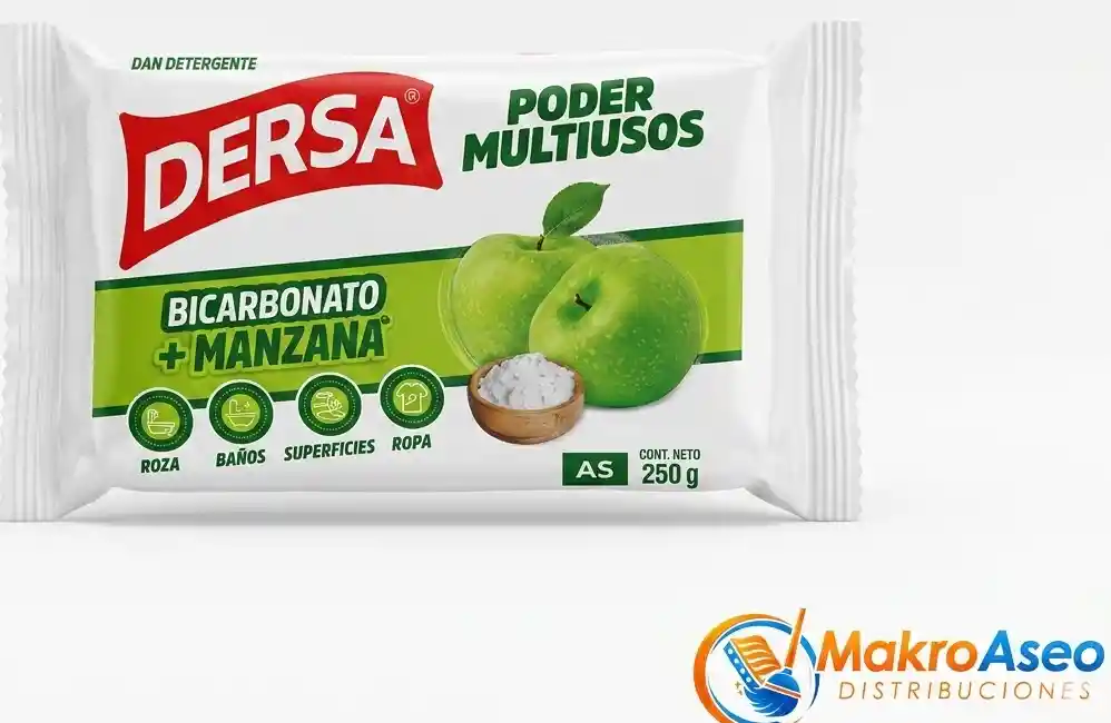 El jabón en barra Dersa Poder Multiusos Bicarbonato + Manzana (250g) es un detergente sólido diseñado para la limpieza profunda del hogar y prendas. Combina el poder desengrasante del detergente con bicarbonato (limpieza/olores) y un aroma a manzana, ofreciendo espuma activa para eliminar suciedad difícil.
