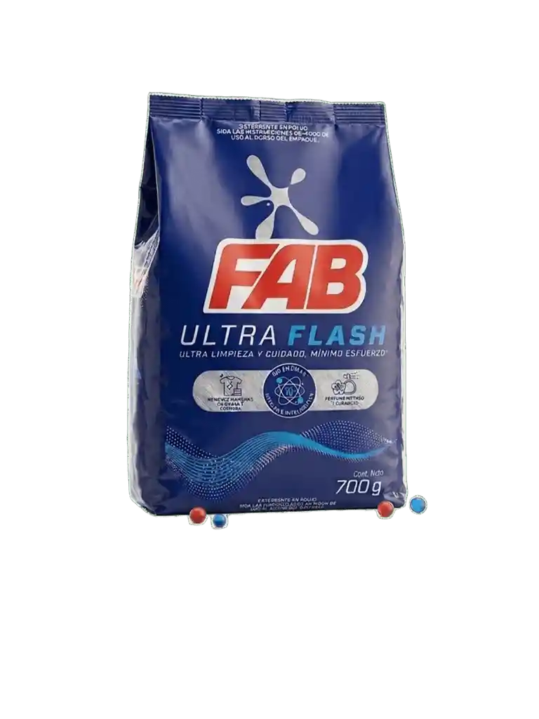 El jabón en polvo Fab Ultra Flash (presentación cercana a 700g-800g) es un detergente diseñado para limpieza profunda y rápida, efectivo incluso sin remojar.