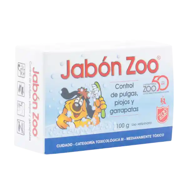 Tratamiento tópico contra pulgas, piojos y garrapatas. DESCRIPCIÓN: En perros para el control y tratamiento del parasitismo. Pulgas: Ctenocephalides canis y Ctenocephalides felis. Piojos: Trichodectes canis y Felicola sp. Garrapatas: Rhipicephalus sanguineus y Dermacentor sp. La permetrina, principio activo de Jabón Zoo®, es un insecticida piretroide extremadamente activo y de efecto inmediato. Paraliza, mata y desprende a los artrópodos por bloqueo del transporte de sodio y potasio en las membranas de las neuronas, inhibe la transmisión nerviosa a lo largo del axón y en la sinapsis del parásito causando parálisis muscular. Por efecto residual actúa como repelente de insectos, efecto que puede durar hasta 7 días. Es el más seguro de los piretroides aprobado para uso en animales de compañía contra pulgas, piojos y garrapatas.