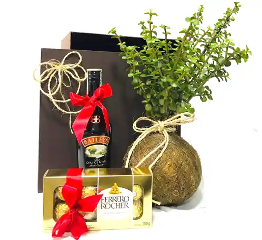 Bonsai Jade Kokedama con Baileys x 375ml, caja de Ferrero Rocher Champagne y caja pasta dura reutilizable.