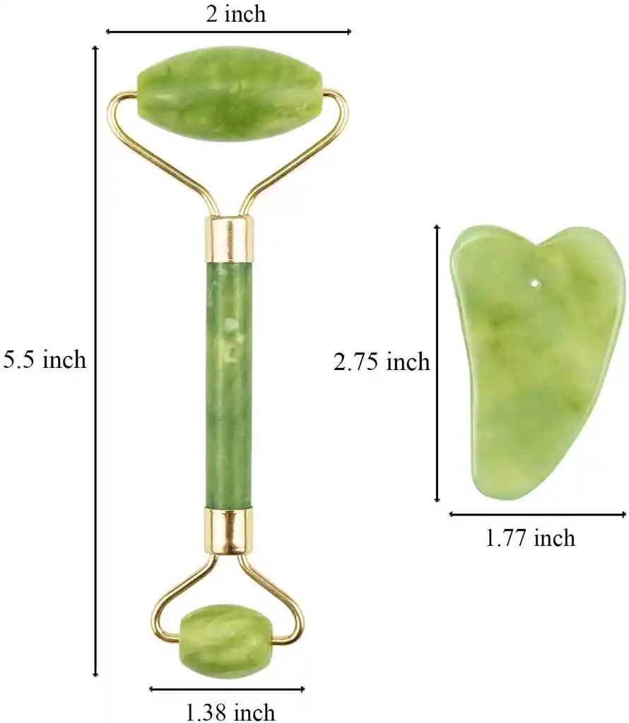 Rodillo facial en piedra de Jade + Piedra Gua Sha en Piedra de Jade. Ideal para masaje facial, estimula el drenaje linfático, baja la inflamación del rostro y bolsas en los ojos, genera efecto relajante y es ideal para distribuir cremas o serums faciales.