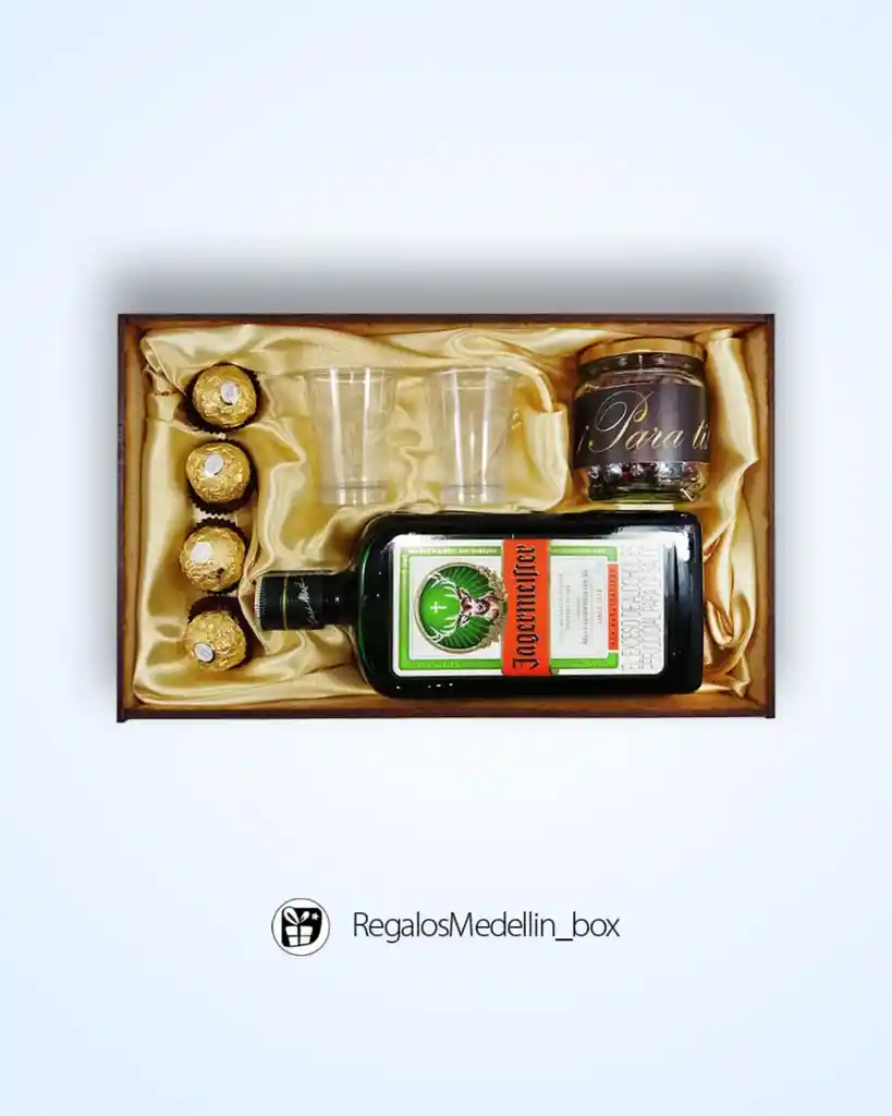 " Regalo En Cofre De Madera, Con 4 Ferrero Rocher, Jagger Botella, Botellita De Cristal Llena De Chocolates Rellenos O Frutos Secos, 2 Copas En Cristal. Viene Con Toda Su Decoración Incluida Con Cintas Y Moños, Base De Tela Satín Y Tarjeta Personalizada." . .. .