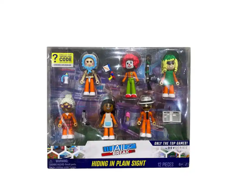 El set Jail Break: Hiding in Plain Sight Figuras de Acción incluye 12 piezas con personajes y accesorios inspirados en el popular juego Jailbreak, ideal para recrear emocionantes aventuras de escape.