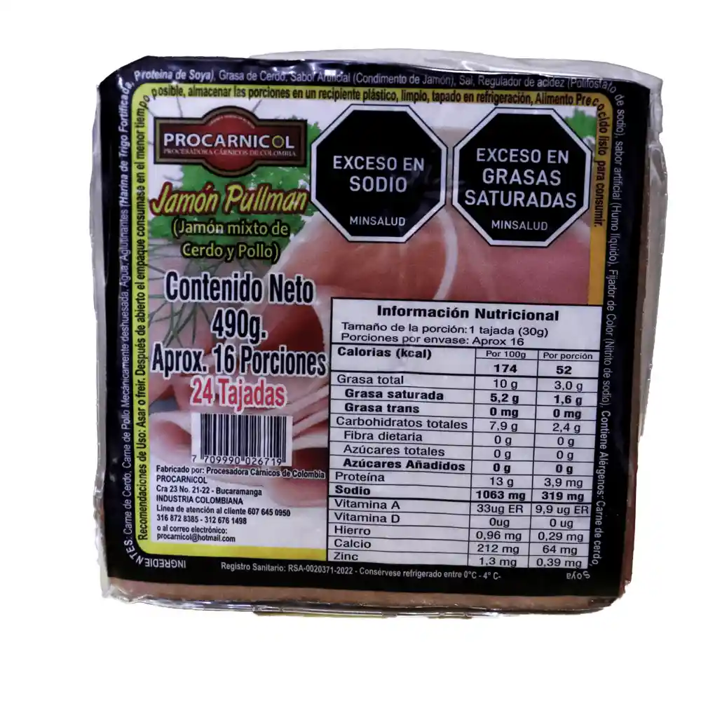 Jamón tajado Pullman mixto de cerdo y pollo, Procarnicol X490 Grs