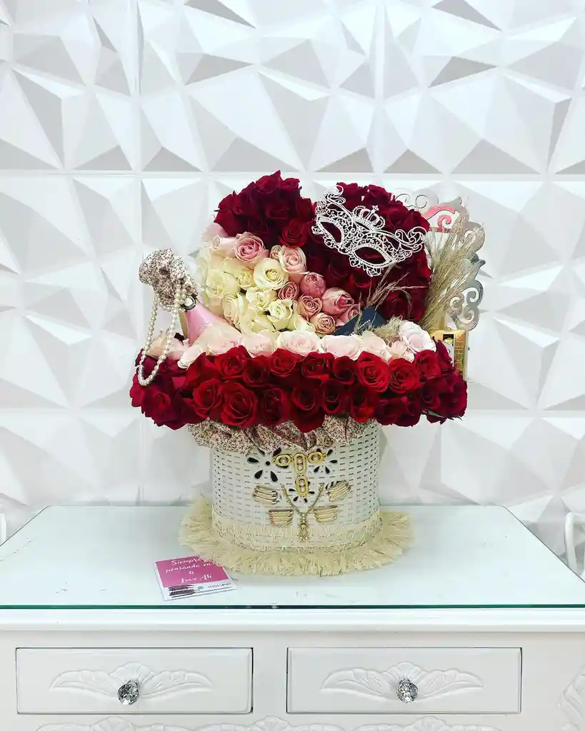 Hermoso y grande tapizado en rosas en forma de coracon,Botella de JP, chocolates ferrero y decorativos elegantes según imagen.( tarjeta incluida)