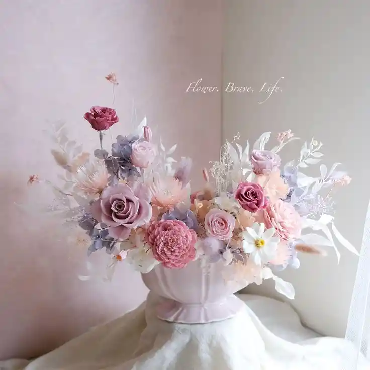 Un universo floral lleno de vida donde las hortensias, mini rosas, pompones y cremones se entrelazan en una paleta suave y encantadora, creando una sensación de abundancia, dulzura y romanticismo que envuelve cualquier espacio con una belleza inolvidable.