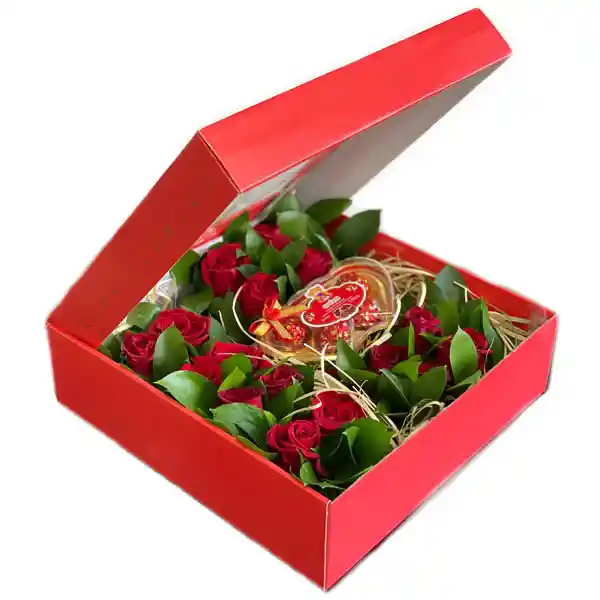 Hermoso jardín de rosas rojas en caja roja de 33 cm x 33 cm; Contiene tres cubetas decoradas con rosas y follaje verde, las cuales puedes sacar de su caja para decorar tu hogar! ¡Este hermoso jardín viene acompañado de chocolates en forma de corazón, lo que lo hace un detalle ideal para endulzar el día de tu ser querido!
