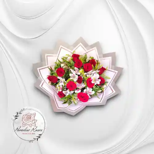 Delicado arreglo floral que combina 24 rosas rojas con astromelias en tonos blancos , creando un bouquet lleno de vida, color y romanticismo. aniversarios, detalles románticos o sorprender a alguien especial.