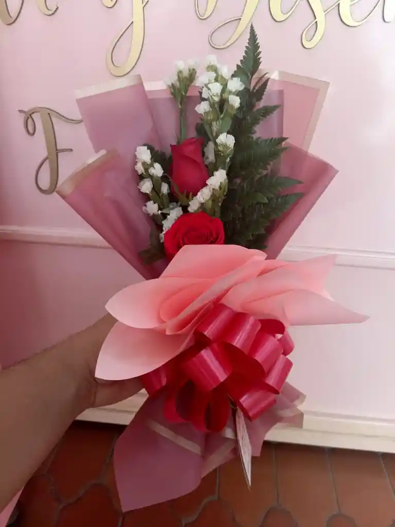 Hermoso arreglo floral elaborado con 2 rosas, papel coreano, moño y follages. Puedes cambiar el color de la rosa de acuerdo a la disponibilidad, acompañado de tarjeta totalmente personalizado.