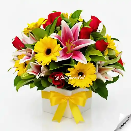 Un pequeño jardín de ensueño que combina flores exóticas y clásicas. Los lirios rosados y las rosas rojas se entrelazan con las vibrantes gerberas amarillas para crear un regalo inolvidable. NOTA : el color de la cinta varía a elección del cliente (Roja, naranja o amarilla).