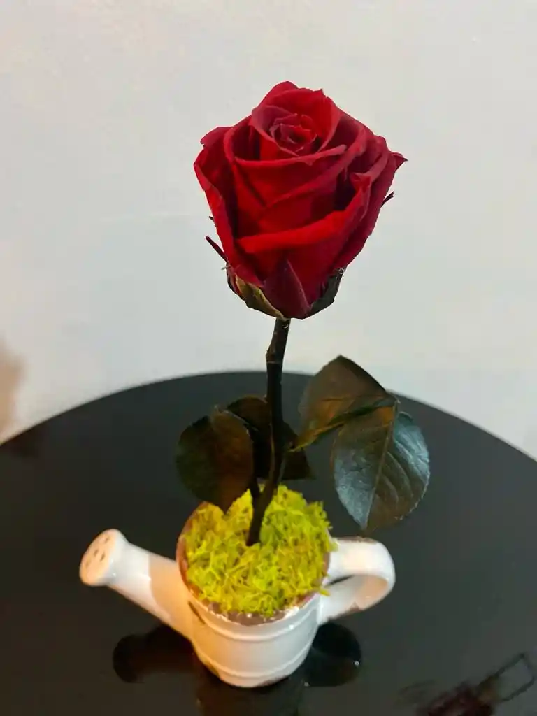 Arreglo floral elaborado en jarrita blanca de cerámica decorada con 1 Hermosa Rosa Medium Preservada y Musgo preservado (Flores Naturales que se someten a un proceso para que perduren por más de un año), Es un precioso arreglo floral que tu ser querido podrá conservar por mucho tiempo, se envía en caja Bukaflor. Incluye: Arreglo floral preservado. Tarjeta con el mensaje que desee. Instrucciones de cuidado de las flores preservadas.