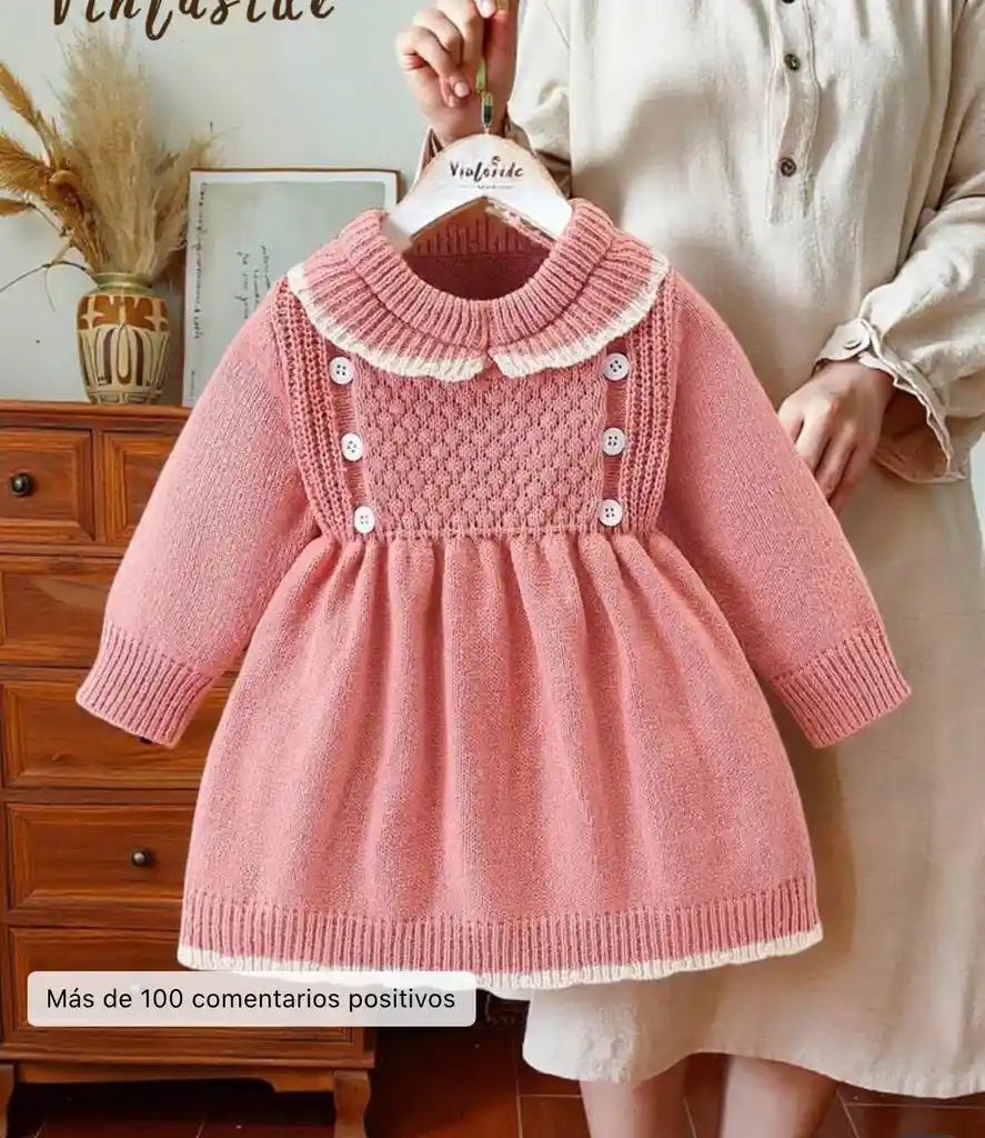 Elegancia clásica y calidez para tu pequeña! Este vestido tejido combina un diseño artístico tradicional con la suavidad necesaria para proteger la piel de tu bebé con total estilo. • Diseño Artesanal Detallado: Presenta un exquisito tejido de punto con diferentes texturas en el pecho y una falda con un vuelo encantador. • Toque Vintage Elegante: Cuenta con un cuello tipo bebé con detalles de encaje en contraste blanco y botones decorativos laterales que realzan su diseño clásico. • Máximo Confort Térmico: Ideal para el clima de Bogotá, este material tejido mantiene la temperatura corporal sin sacrificar la transpirabilidad. • Ajuste y Suavidad: Los acabados en puños y cintura aseguran que el vestido mantenga su forma mientras permite que el bebé se mueva con total libertad. • Prenda de Colección: Un diseño atemporal que destaca en cualquier reunión y es perfecto para crear recuerdos inolvidables.