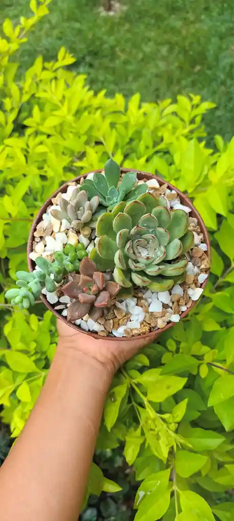 jardines suculentos con variedad de suclentas coloridas ideal para detalles llenos de vida para esa persona tan especial tamaño de matera p14 - lleva moño de regalo Cuidados, regar cada vez que sustrato este seco debe recibir sol parcial.