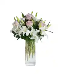 Jarron de 12 rosas color lila y 5 lirios blancos. La flor puede ser sustituida dependiendo la disponibilidad de color y del producto “Mensaje Personalizado” máximo de 30 caracteres (Dejar el mensaje en el chat, los comentarios no se previsualizan para la tienda por lo que si se dejan allí no podrá ser incluido)