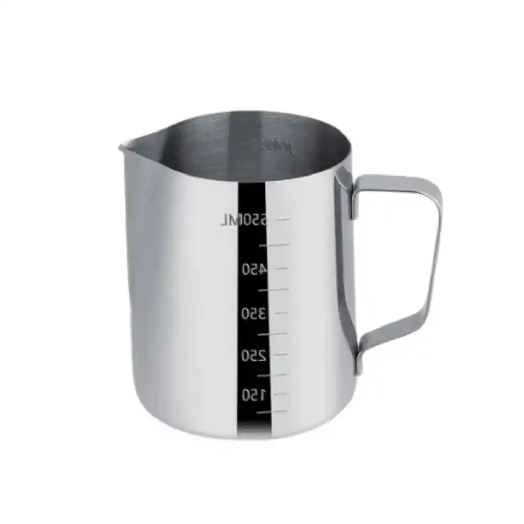 Jarra de acero ideal para espumar leche, preparar café latte, capuchino o servir cualquier tipo de bebida caliente con precisión. Su diseño elegante y resistente incluye una boquilla en forma de pico que permite verter con control. La jarra cuenta con marcas de medición grabadas en su interior facilitando el control de las porciones hasta 550 ml. El mango ergonómico asegura un agarre cómodo y seguro, lo que la convierte en una herramiente esencial tanto para baristar profesionales como para amantes del café en casa.
