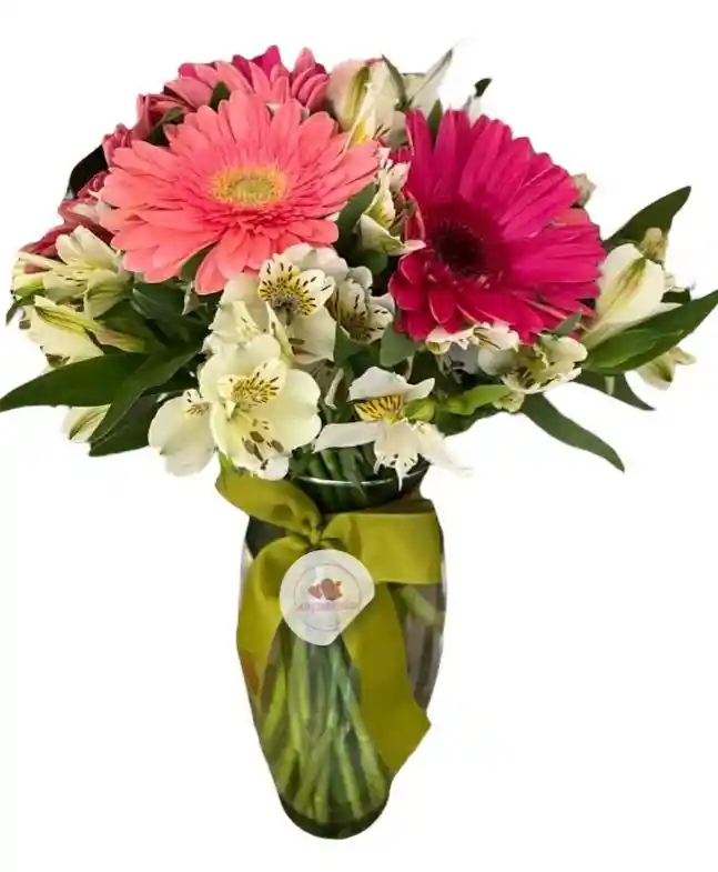 "No necesitas una razón, solo el deseo de hacer sonreír. Las gerberas son el detalle espontáneo y perfecto para decir 'pienso en ti'." JARRON CON: GERBERAS , ASTROMELIAS ,MOÑO Y TARJETA