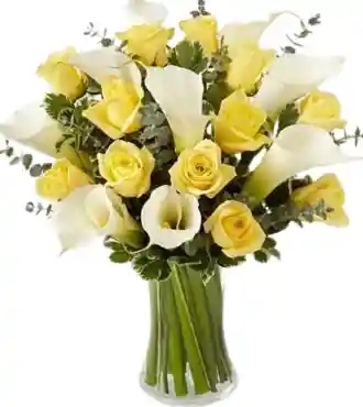 Jarrón de rosas amarillas con cartuchos blancos Un sofisticado jarrón con una combinación de cartuchos y 12 rosas, creando un arreglo elegante y lleno de significado. Nota: La flor puede ser sustituida dependiendo de la disponibilidad de color y del producto. "Mensaje Personalizado" máximo de 30 caracteres (Dejar el mensaje en el chat, los comentarios no se previsualizan para la tienda, por lo que si se dejan allí no podrá ser incluido).