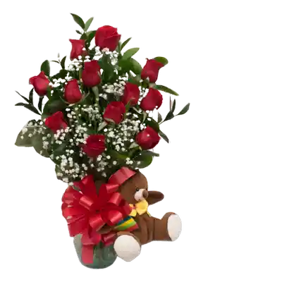 Jarrón Con 12 Rosas Rojas y Peluche de Oso Según Disponibilidad, Incluye Tarjeta Impresa. ideal para el Amor