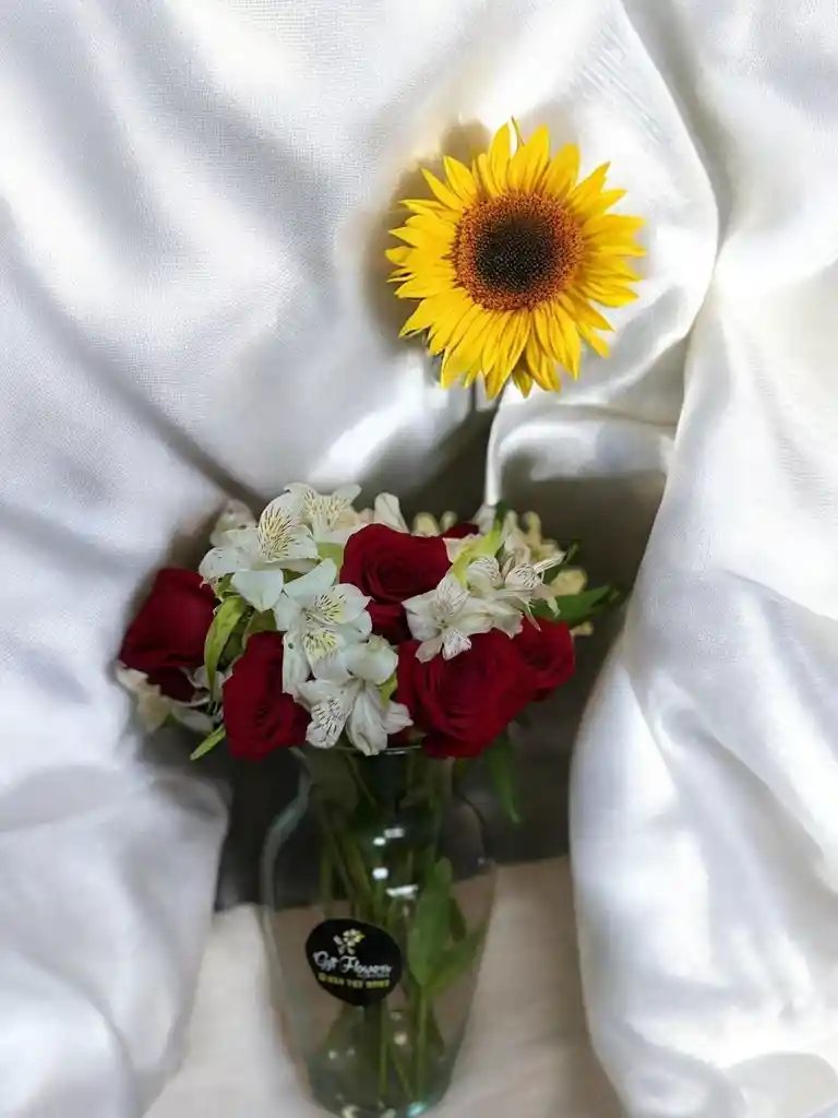 Jarron de 12 rosas rojas y astromelia blanca. Nota: La flor puede ser sustituida dependiendo la disponibilidad de color y del producto “Mensaje Personalizado” máximo de 30 caracteres (Dejar el mensaje en el chat, los comentarios no se previsualizan para la tienda por lo que si se dejan allí no podrá ser incluido).
