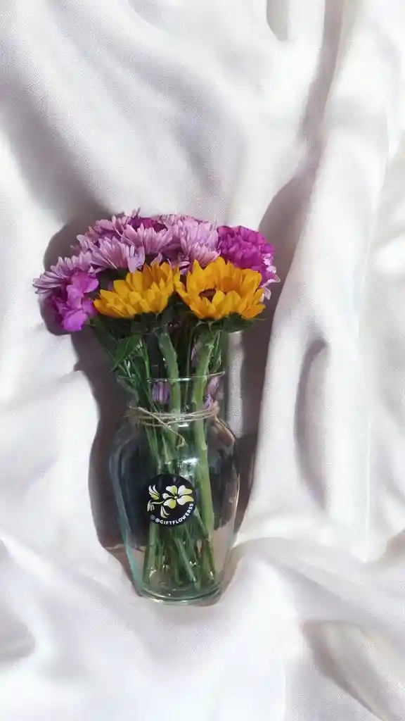Jarron de margaritas moradas acompañadas de 2 girasoles. Nota: La flor puede ser sustituida dependiendo la disponibilidad de color y del producto “Mensaje Personalizado” máximo de 30 caracteres (Dejar el mensaje en el chat, los comentarios no se previsualizan para la tienda por lo que si se dejan allí no podrá ser incluido).