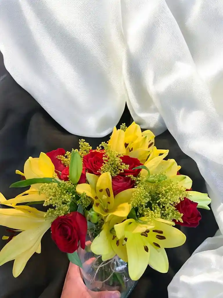 Jarron con aprox. 4 varas de lirios y 12 rosas rojas con soliago. Nota: La flor puede ser sustituida dependiendo la disponibilidad de color y del producto “Mensaje Personalizado” máximo de 30 caracteres (Dejar el mensaje en el chat, los comentarios no se previsualizan para la tienda por lo que si se dejan allí no podrá ser incluido).