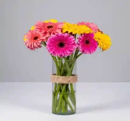 Florero con gerberas de distintos colores mas tarjeta perosnalizada.