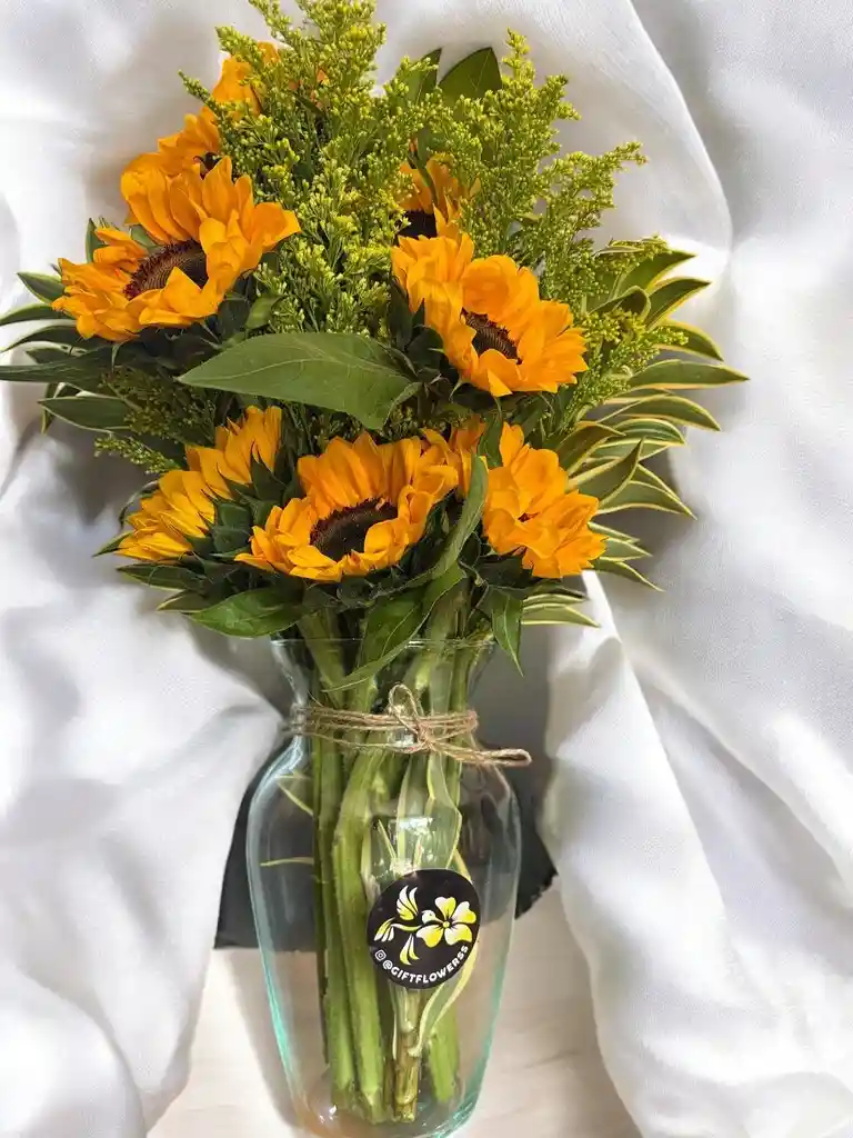 Jarron con aprox. 8 girasoles y soliago. Nota: La flor puede ser sustituida dependiendo la disponibilidad de color y del producto “Mensaje Personalizado” máximo de 30 caracteres (Dejar el mensaje en el chat, los comentarios no se previsualizan para la tienda por lo que si se dejan allí no podrá ser incluido).