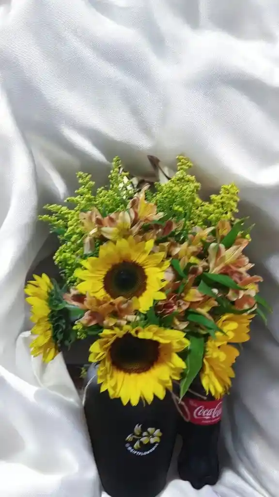 Jarron de 4 unidades de girasol, acompañados de astromelia y solidago. Nota: La flor puede ser sustituida dependiendo la disponibilidad de color y del producto “Mensaje Personalizado” máximo de 30 caracteres (Dejar el mensaje en el chat, los comentarios no se previsualizan para la tienda por lo que si se dejan allí no podrá ser incluido).