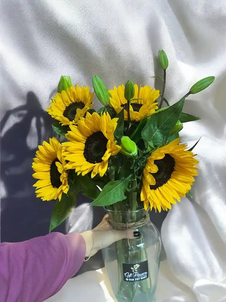 Jarron 5 girasoles con 4 varas de lirios. Nota: La flor puede ser sustituida dependiendo la disponibilidad de color y del producto “Mensaje Personalizado” máximo de 30 caracteres (Dejar el mensaje en el chat, los comentarios no se previsualizan para la tienda por lo que si se dejan allí no podrá ser incluido).