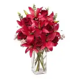 Bouquet de 6 rosas rojas y 9 lirios rojos con 10 varas de follaje.La flor puede ser sustituida dependiendo la disponibilidad de color y del producto “Mensaje Personalizado” máximo de 30 caracteres (Dejar el mensaje en el chat, los comentarios no se previsualizan para la tienda por lo que si se dejan allí no podrá ser incluido)