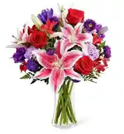 Jarrón de 4 varas de lirios rosados con 12 rosas rojas y 1 paquete de astromelia morada con rusco Nota: La flor puede ser sustituida dependiendo la disponibilidad de color y del producto “Mensaje Personalizado” máximo de 30 caracteres (Dejar el mensaje en el chat, los comentarios no se previsualizan para la tienda por lo que si se dejan allí no podrá ser incluido).