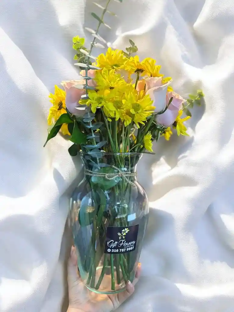 Jarron con aprox.12 rosas rosadas y 1 paquete de margarita amarilla con eucalipto. Nota: La flor puede ser sustituida dependiendo la disponibilidad de color y del producto “Mensaje Personalizado” máximo de 30 caracteres (Dejar el mensaje en el chat, los comentarios no se previsualizan para la tienda por lo que si se dejan allí no podrá ser incluido).