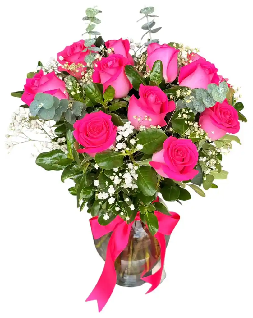 Arreglo floral x 12 rosas tipo exportación en tonalidad fucsia Diseño elaborado en un jarrón forma caobo de vidrio Follaje fino como gipsófila, brillantina ,eucalipto baby Moño en cinta de tela fucsia